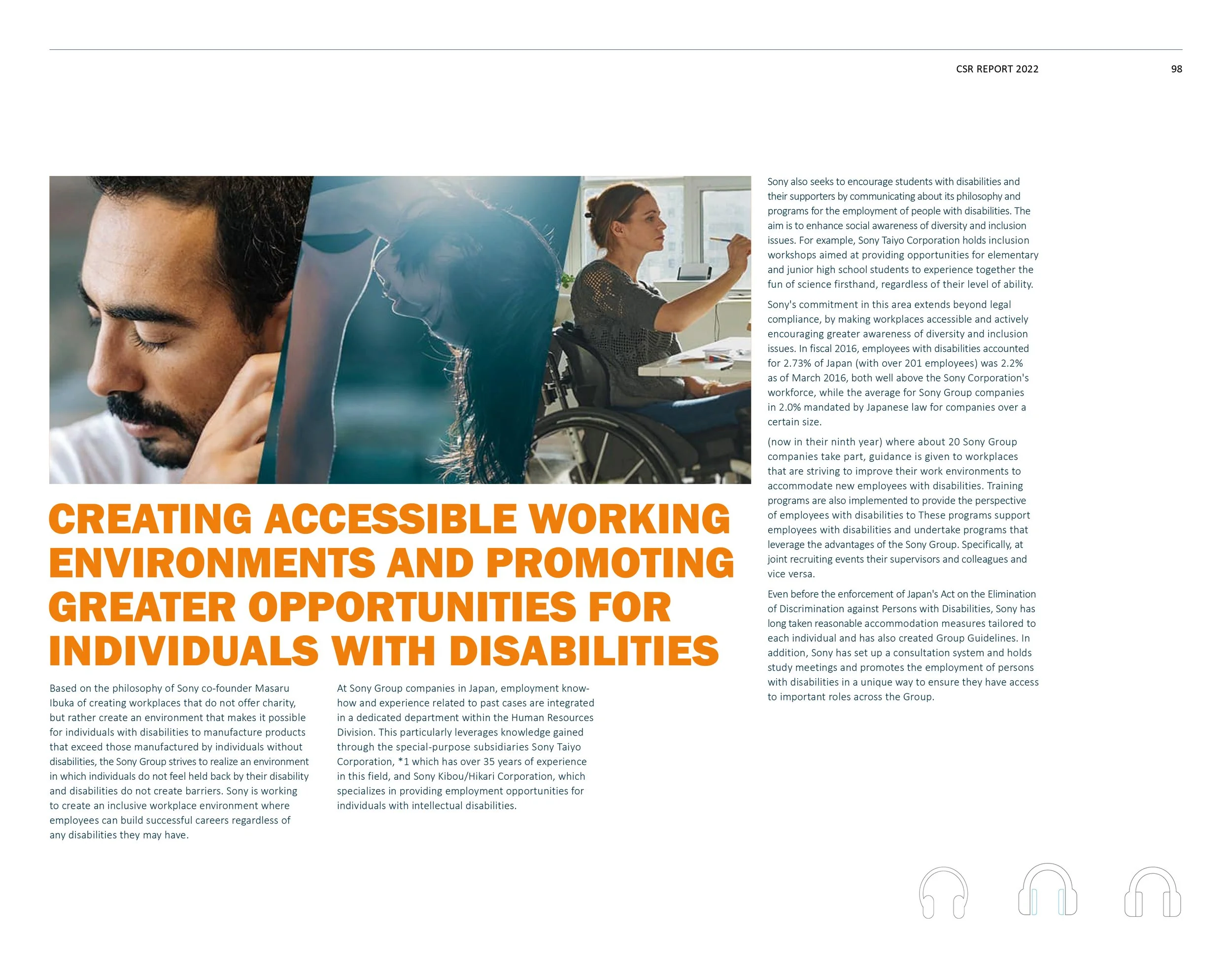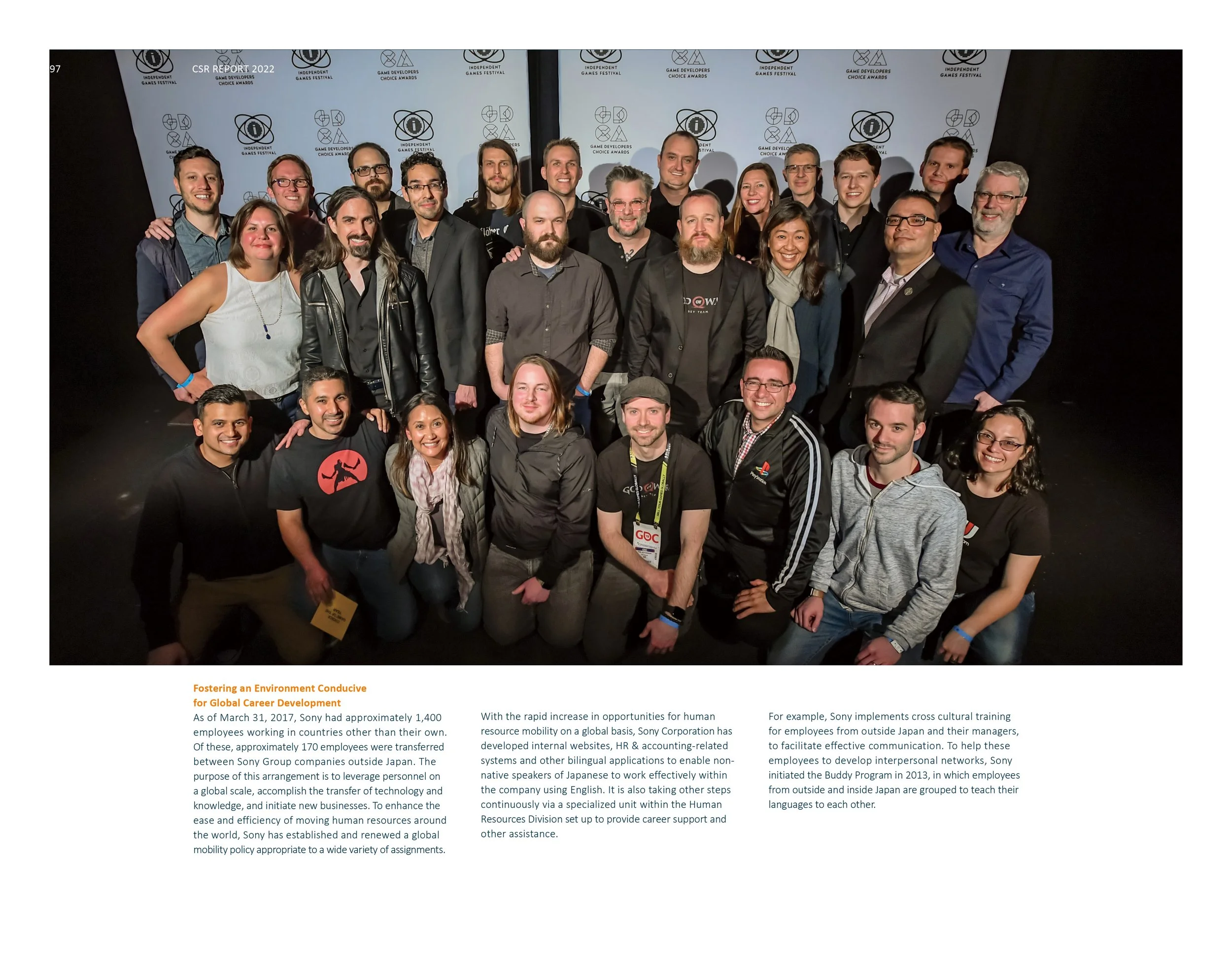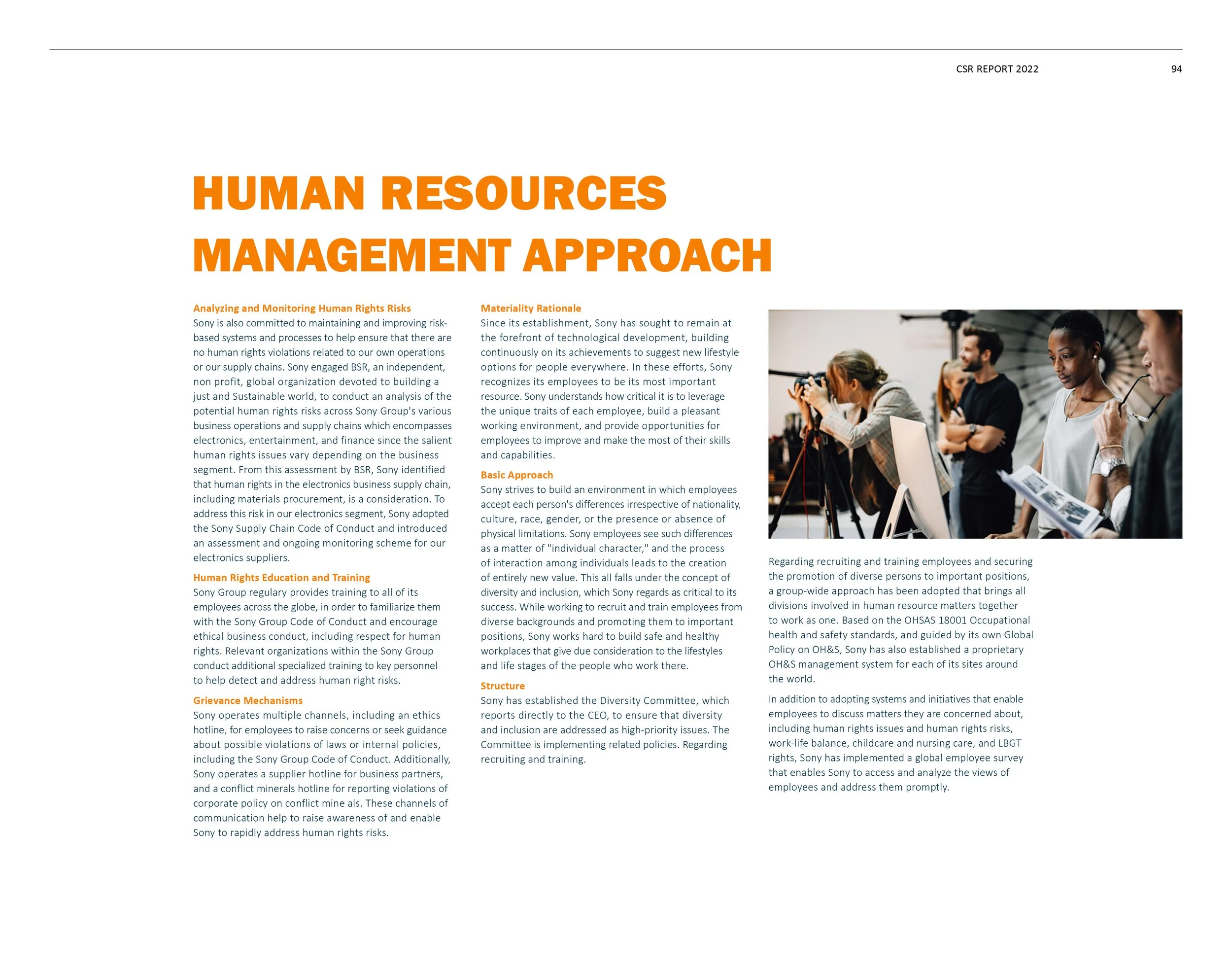 Highlights Sony’s people-first approach, with an emphasis on diversity and inclusion, safe and healthy workplaces, and policies that support sustainable work styles and long-term career development.