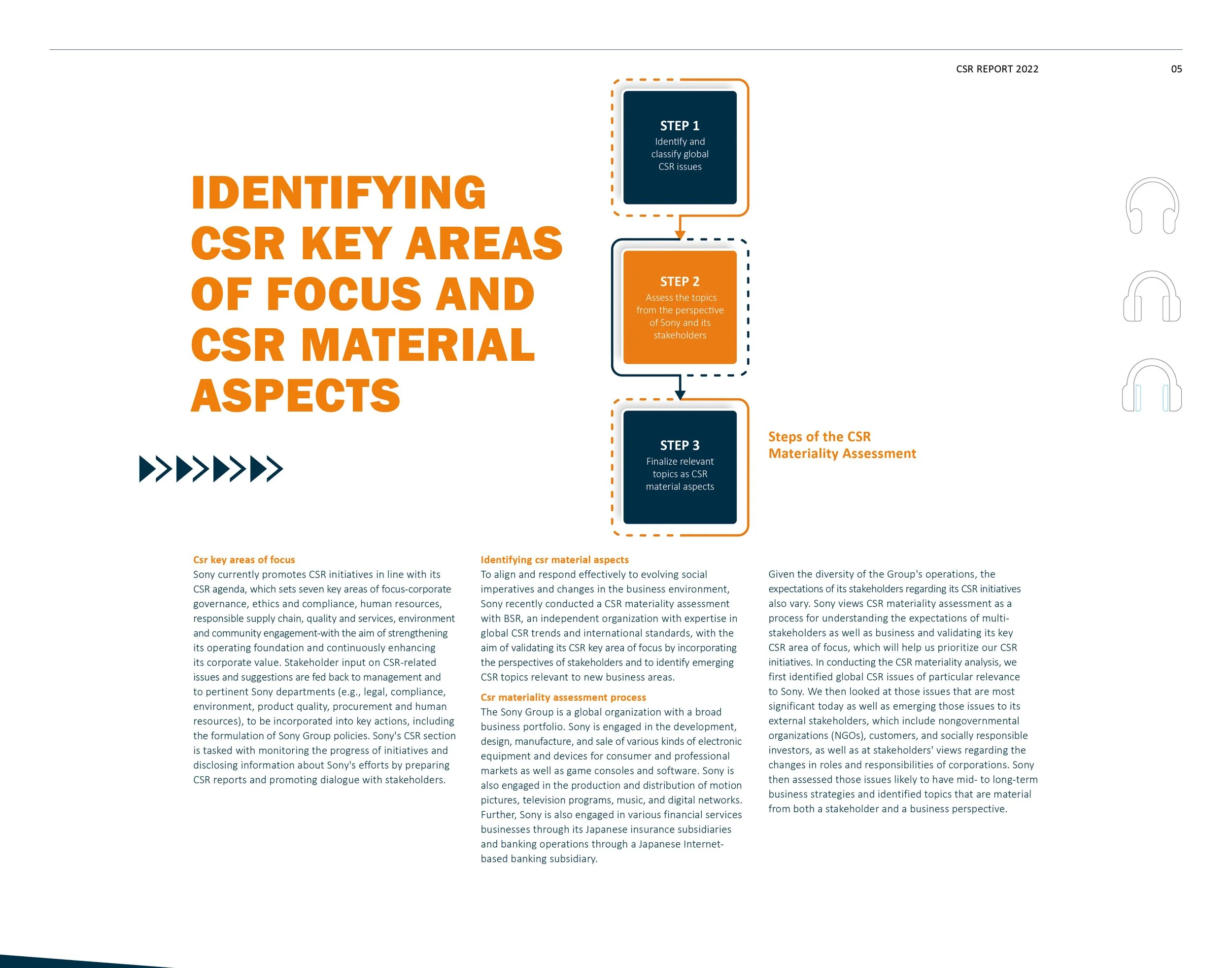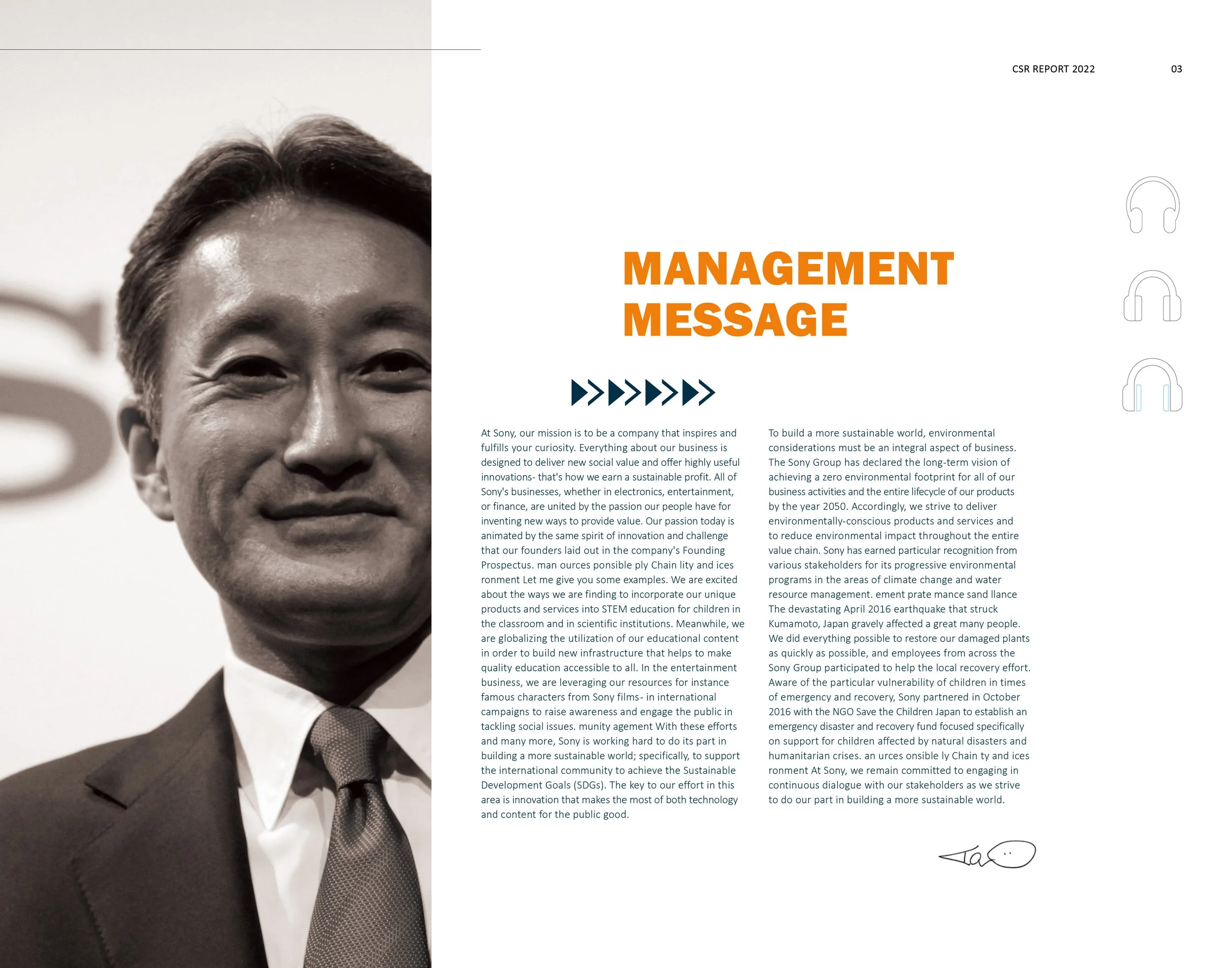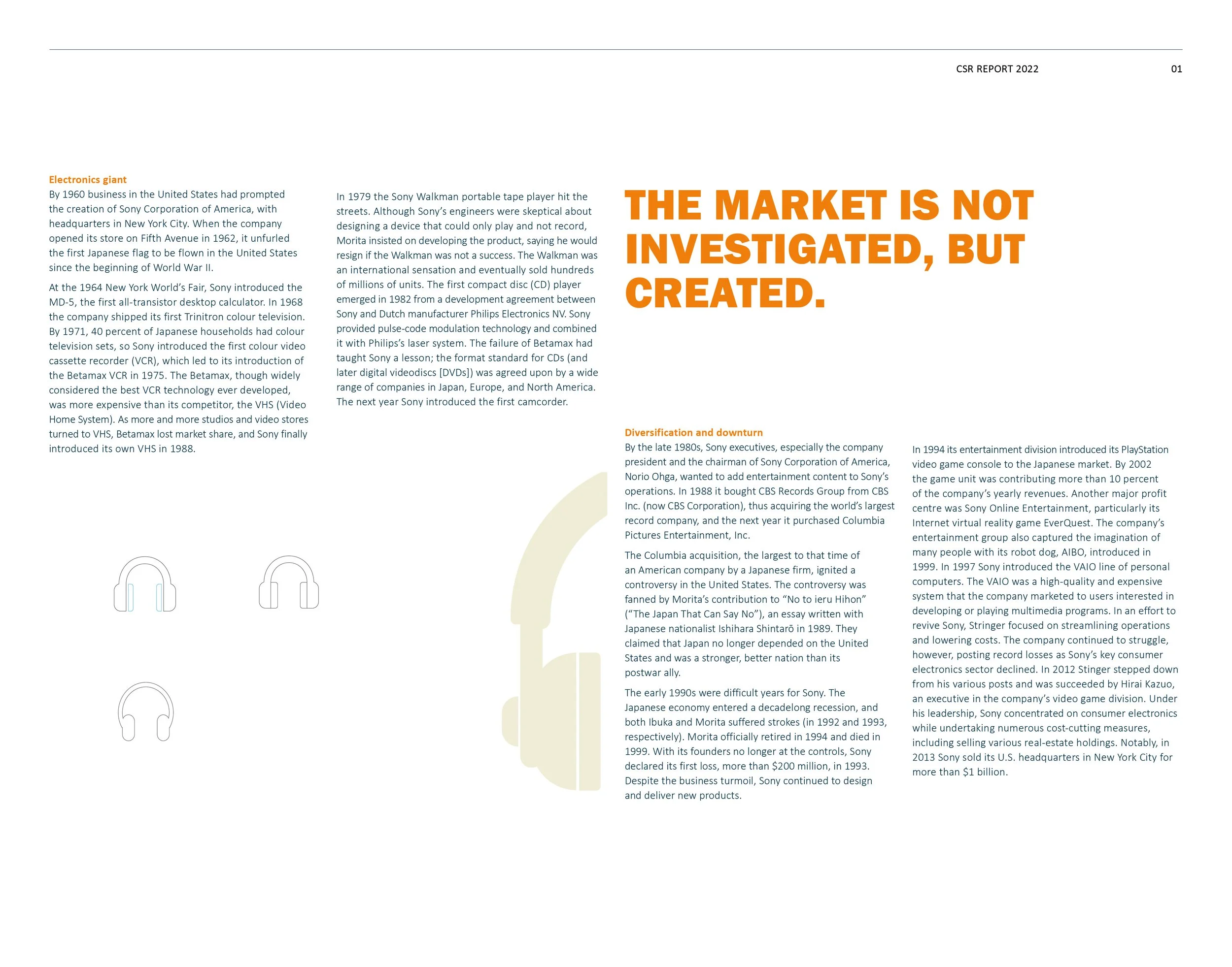 Visual elements such as data motifs and headphone icons reference Sony’s scale and its iconic products, reinforcing the brand’s presence throughout the report.