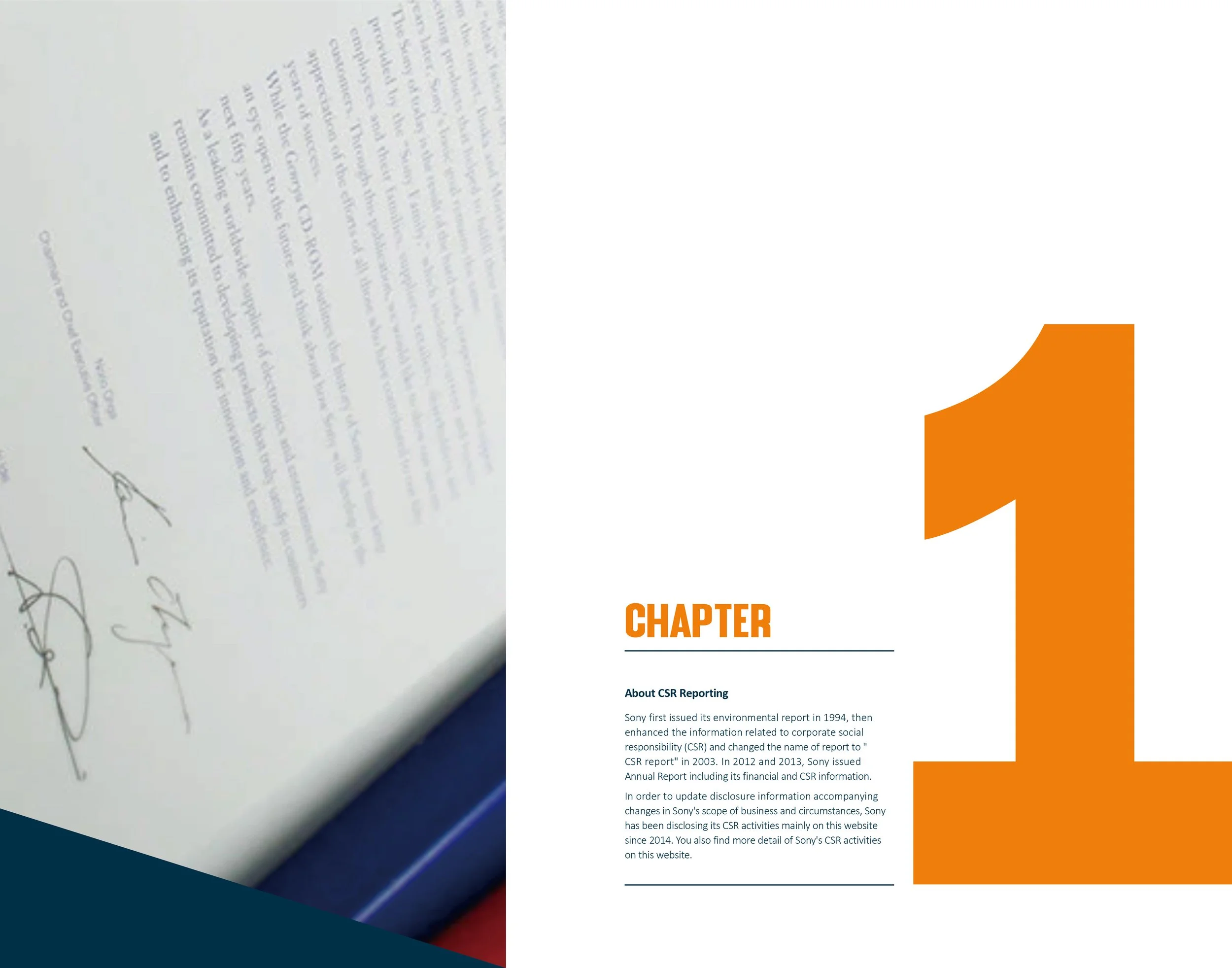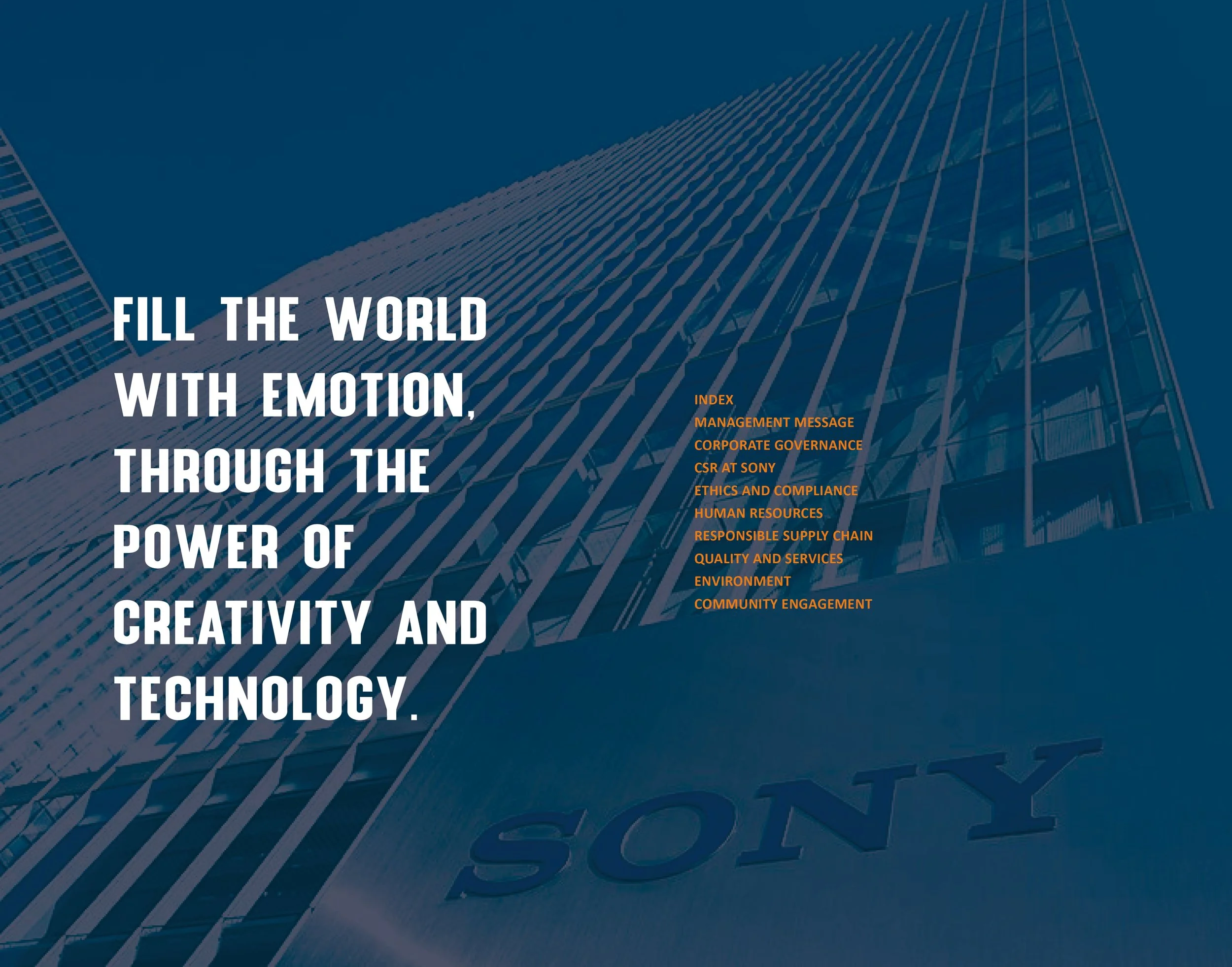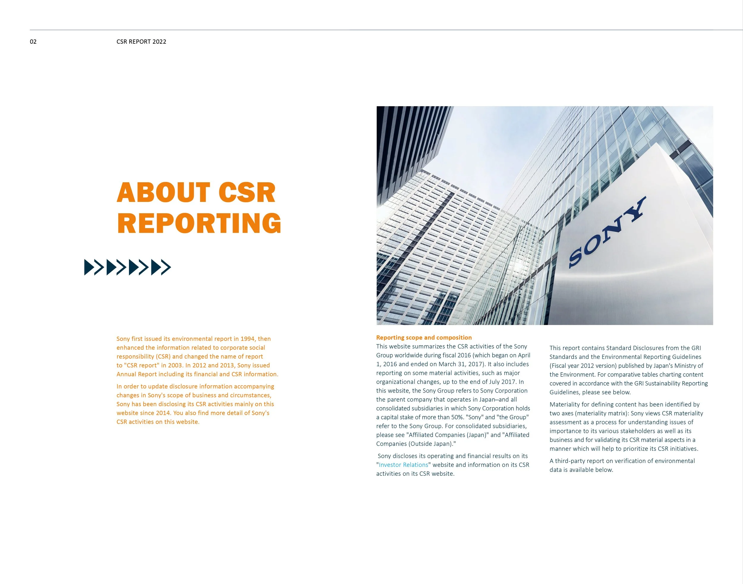 The front cover features Sony’s headquarters, emphasizing the report as a corporate narrative rooted in the company itself.