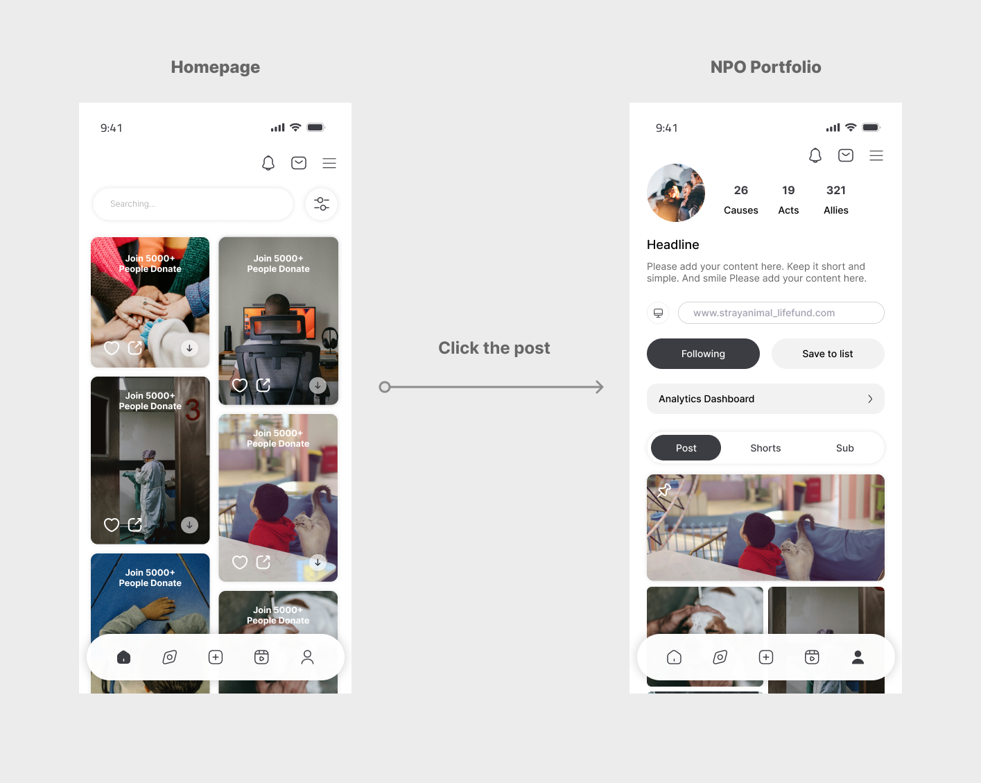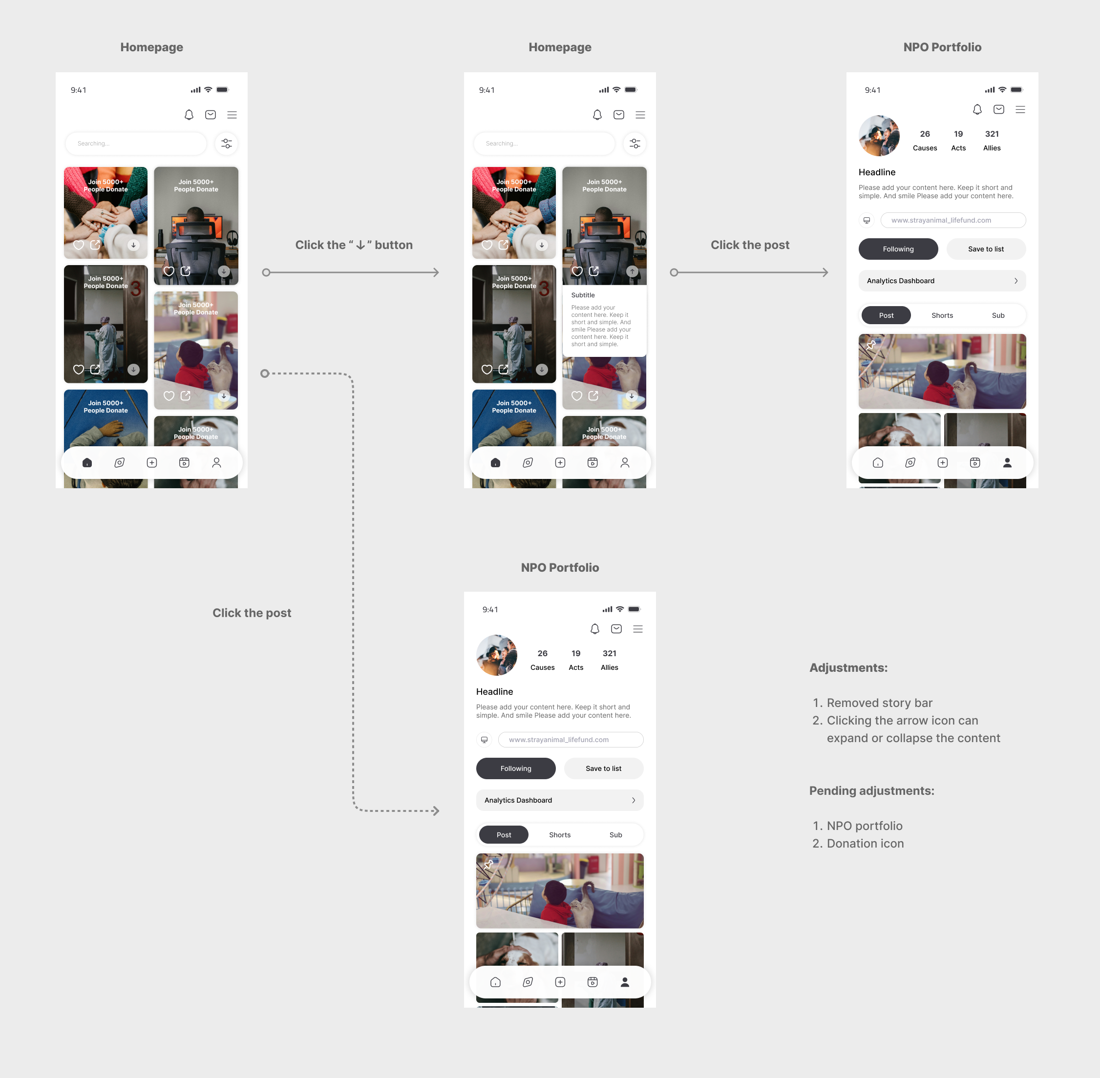 To find the most intuitive navigation, we tested different paths from the Homepage to the NPO Portfolio. We simplified the interface by removing the story bar to reduce visual clutter, allowing users to focus entirely on the causes.